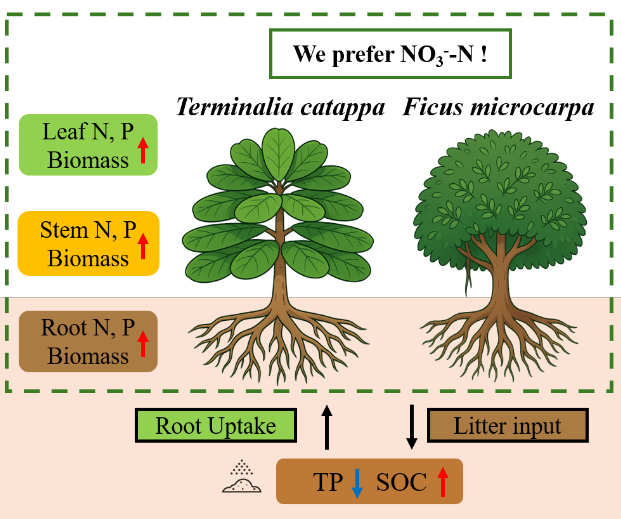 热带珊瑚岛土壤呈强碱性、保肥力弱且氮素严重匮乏。传统植被恢复常依赖增加施肥量,极易导致氮素流失及环境风险。为此,中国科学院华南植物园小良站团队利用15n同位素示踪技术,以珊瑚砂为基质,选取细叶榕(ficus microcarpa)和大叶榄仁(terminalia catappa)两种热带珊瑚岛适生物种,系统评估了铵态氮、硝态氮和酰胺态氮三种形态对植物生长及土壤养分固持的影响。图1. 不同氮肥形态下细叶榕和大叶榄仁各器官的生长及养分响应研究发现,氮肥形态是决定养分利用效率的关键。据此,团队提出应修正“以施肥量为中心”的传统思路,转向“以氮肥形态优化为核心”。建议在珊瑚岛植被恢复中(特别是在干季),采用以硝态氮为主的肥料,并结合有机改良与控释技术。该策略在提升植物生产力的同时,能显著降低氮素流失风险,为脆弱珊瑚岛生态系统的可持续管理提供了关键科技支撑。图2. 氮肥形态调控珊瑚岛土壤养分与植物吸收的机理示意图相关成果以 “nitrogen form governs nutrient retention and plant uptake in coral island soils: evidence from a 15n-tracing experiment” 为题发表于 journal of plant ecology。中国科学院华南植物园博士研究生陈涵为第一作者,王法明研究员为通讯作者。该研究得到国家重点研发计划项目的资助。
