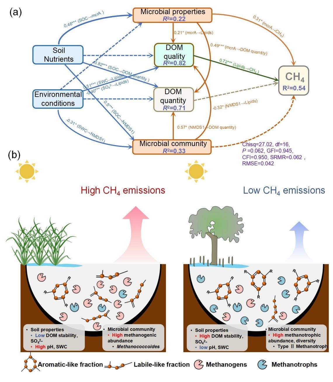 互花米草(spartina alterniflora)是近几十年来在我国滨海湿地迅速扩张的重要外来入侵植物,其较快的生长速率和有机质输入会深刻影响湿地土壤碳循环过程。然而,互花米草入侵是否会改变滨海湿地的甲烷排放以及其背后的微生物生态机制,仍存在认识不足。科研团队研究基于珠海淇澳红树林自然保护区,从光滩、互花米草入侵区与原生红树林区开展了一年期原位连续监测,并结合土壤理化性质、溶解性有机质分子组成(dom)特征以及产甲烷菌与甲烷氧化菌群落结构分析,系统揭示了互花米草入侵对土壤甲烷排放的影响机制。结果表明,与红树林土壤相比,互花米草入侵使土壤甲烷排放量显著升高,其年平均甲烷排放速率约为红树林生态系统的 8.7 倍。进一步分析显示,互花米草入侵导致土壤中可降解有机质组分(如脂类和蛋白/脂肪族类物质)显著增加,而土壤硫酸盐、土壤有机碳和总氮含量下降。这些变化不仅降低了dom的分子稳定性,还为产甲烷菌提供了更多可利用底物,从而增强甲烷生成过程。微生物群落分析发现,互花米草入侵土壤中产甲烷菌的丰度上升,尤其是能够利用可降解有机基质的 methanococcoides 相对丰度增加;另一方面,甲烷氧化菌的丰度和多样性下降,尤其是具有高甲烷亲和能力的ⅱ型甲烷氧化菌显著减少。这种“产甲烷增强”与“甲烷氧化削弱”的协同作用,最终加剧了土壤甲烷的排放,进而削弱了滨海湿地的碳汇功能。相关研究以“spartina alterniflora invasion enhances soil methane emissions in coastal wetlands by increasing labile organic matter and restructuring methane-cycling microbial communities”为题近期发表在国际学术期刊journal of plant ecology (《植物生态学报》)(if5=3.9)上。中国科学院华南植物园小良站覃国铭博士为第一作者,王法明研究员为通讯作者。该研究得到国家自然科学基金、国家重点研发计划、中国科学院青年科学家基础研究项目、广东省基础与应用基础研究基金、南方海洋科学与工程广东实验室(珠海)等项目资助。图. 互花米草入侵驱动红树林土壤甲烷排放的机制示意图